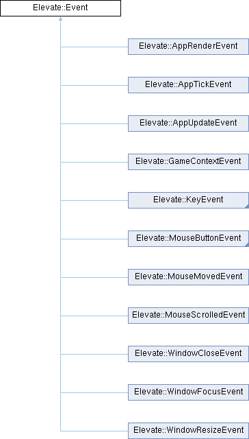 Reimplemented in Elevate::GameContextEvent, Elevate::WindowResizeEvent, Elevate::WindowFocusEvent, Elevate::KeyPressedEvent, Elevate::KeyReleasedEvent, Elevate::KeyTypedEvent, Elevate::MouseMovedEvent, Elevate::MouseScrolledEvent, Elevate::MouseButtonPressedEvent, and Elevate::MouseButtonReleasedEvent.